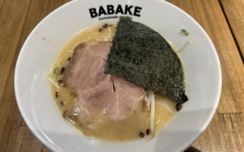 長崎駅構内にてラーメン。 「BABAKE」。客でにぎわっています。 メニュー。らーめん白(950円)を選択! すぐやってきた。3分くらい。 マイルドな豚骨ラーメンという感じ。一風堂に近しい 美味しいけど、量が少ない! 駅...