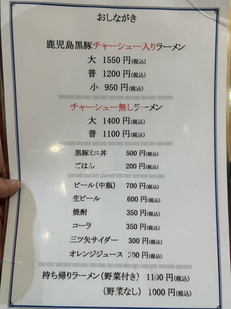 鹿児島黒豚チャーシューラーメン普通(1200円)を頼みます。