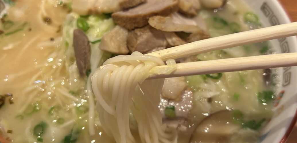 味は薄め。長浜ラーメンの旨味を抜いて、椎茸と塩を入れたようなスープ。