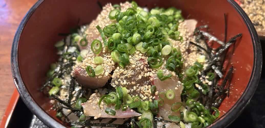 魚の切身を特製のタレに浸し、ゴマ・ネギをまぶした琉球(郷土料理)をごはんにのせました。