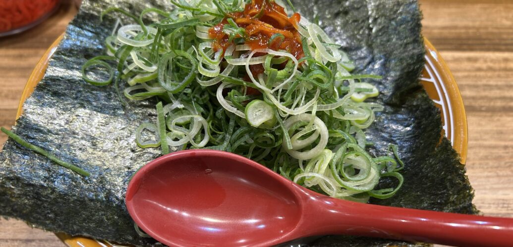 3分でやってきた。海苔、でかすぎ。ネギ、多すぎ。
